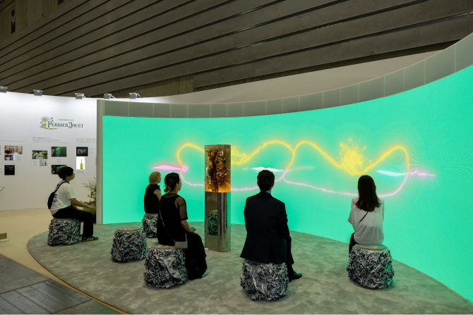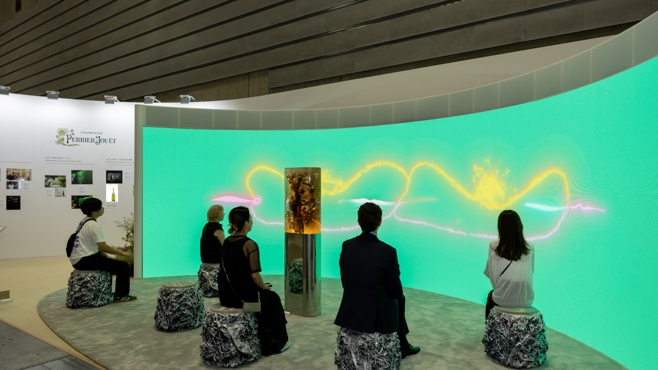 Tokyo Gendai会場内にはペリエ ジュエのスペシャルバー・ラウンジがオープン。来場者はバイザグラスで提供されるシャンパーニュを味わいながら、メゾンのテロワールを閉じ込めた現代のハーバリウム(植物標本)と、植物が発信するシグナルを視覚化した映像作品を体験した。表参道で開催されるポップアップでも、引き続きこのコンセプトを受け継いだ『Plant Pulses(植物の鼓動)』が展示される予定だ。