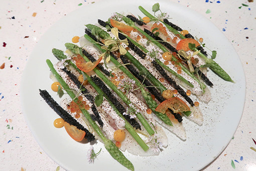 ビジュアル効果満点で食欲を刺激。フレッシュな魚の味が野生アスパラと炭黒パンのトーストの食感と混じり合い、独特なハーモニーが生まれる。