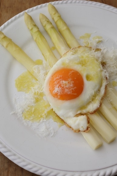 まずは、アスパラガスの目玉焼き乗せから。黄身を崩してヴィネグレットソースと絡めていただきます。