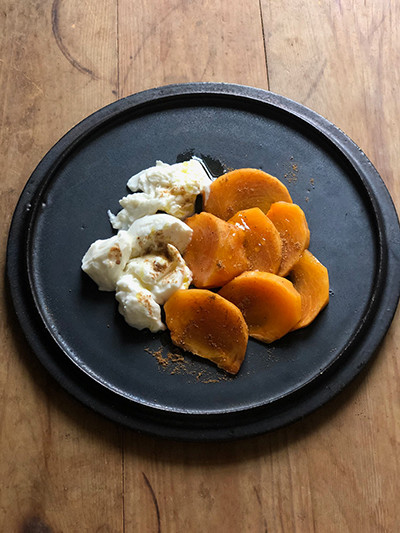 最近はいつもの柿料理にスパイスをひと振りすることが気に入っています。使うスパイスはカルダモン。カルダモンの香りを柿に纏わせると、甘くエキゾティックな印象が強まります。届いたばかりのオイルのヌーヴォー、オリーブオイルノベッロもひと回し。ワインはボジョレーやオレンジワインなど軽やかなタンニンを同調させるとより一層その風味を楽しめます。