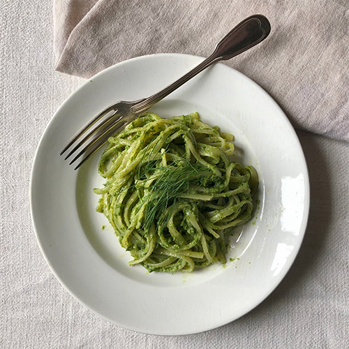 ●ペースト:フェンネルの軸と葉は合わせて120g、松の実またはカシューナッツは30g、パルミジャーノチーズは20g、ニンニクを1/2かけ、カシューナッツとアーモンド30g、オリーブオイルを2/3カップ、塩を小さじ1/2、これらすべてミキサーにかけるだけ。