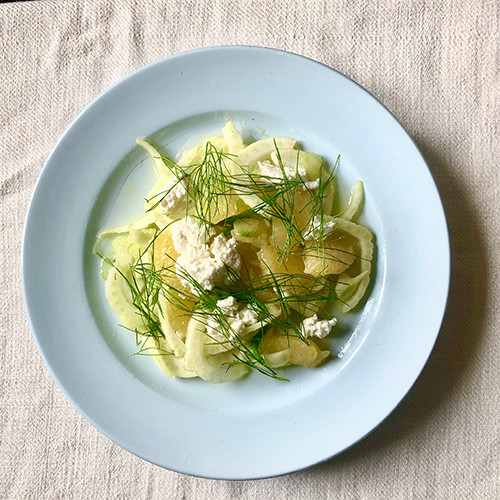 ⒉ オリーブオイル、ビネガー、塩、コショウで⒈ を和え、リコッタチーズ、フェンネルの葉をトッピングする。フェンネルは少ししんなりしてもおいしいので、作り置きサラダとしてもおすすめ。