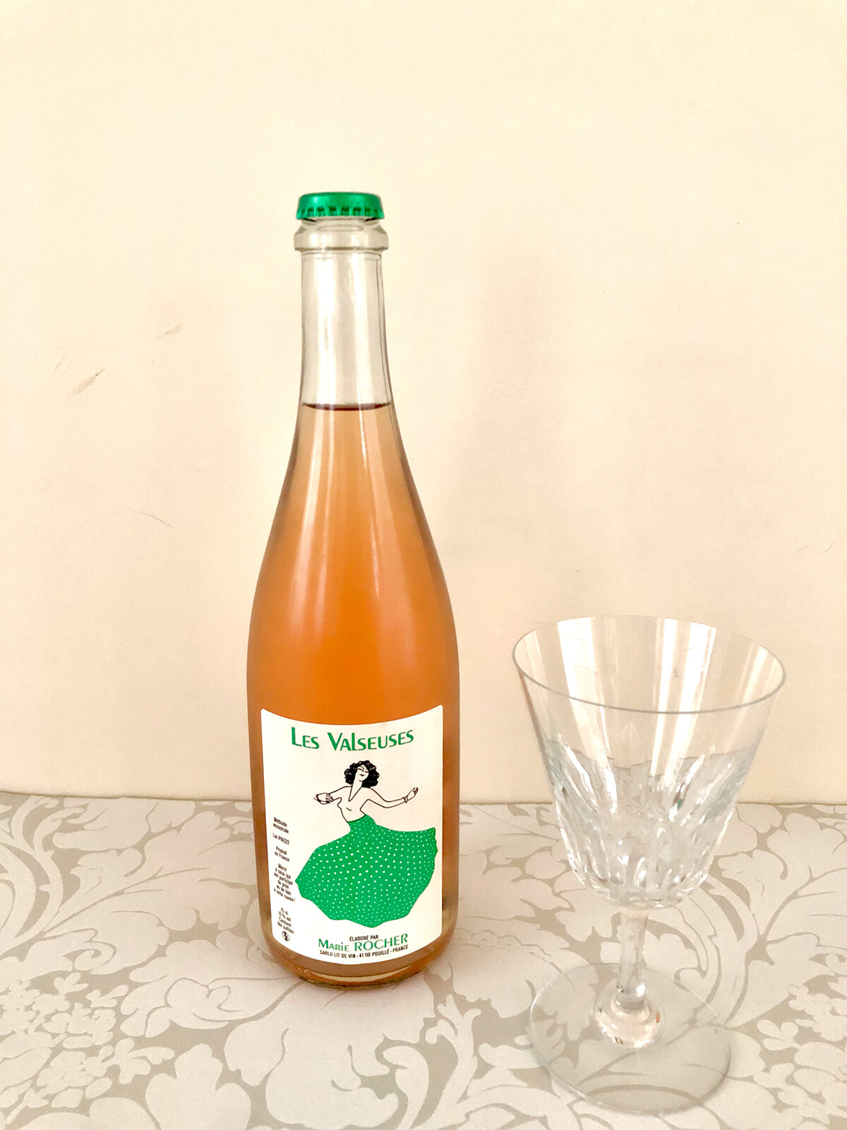 合わせたワインはパリ生まれの醸造家マリー・ロシェのロゼワイン。2018年にデビューするなり、パリやヨーロッパで大ブレイク。ワインの名前「ヴァルスーズ」は自由な価値観を持って生きる若者を描いたベルトラン・ブリエ監督の同名の映画から名付けられたもの。そして、ピチピチと跳ねるワインの泡はエチケットのようにワルツを踊っている人を連想させてくれるような味です。