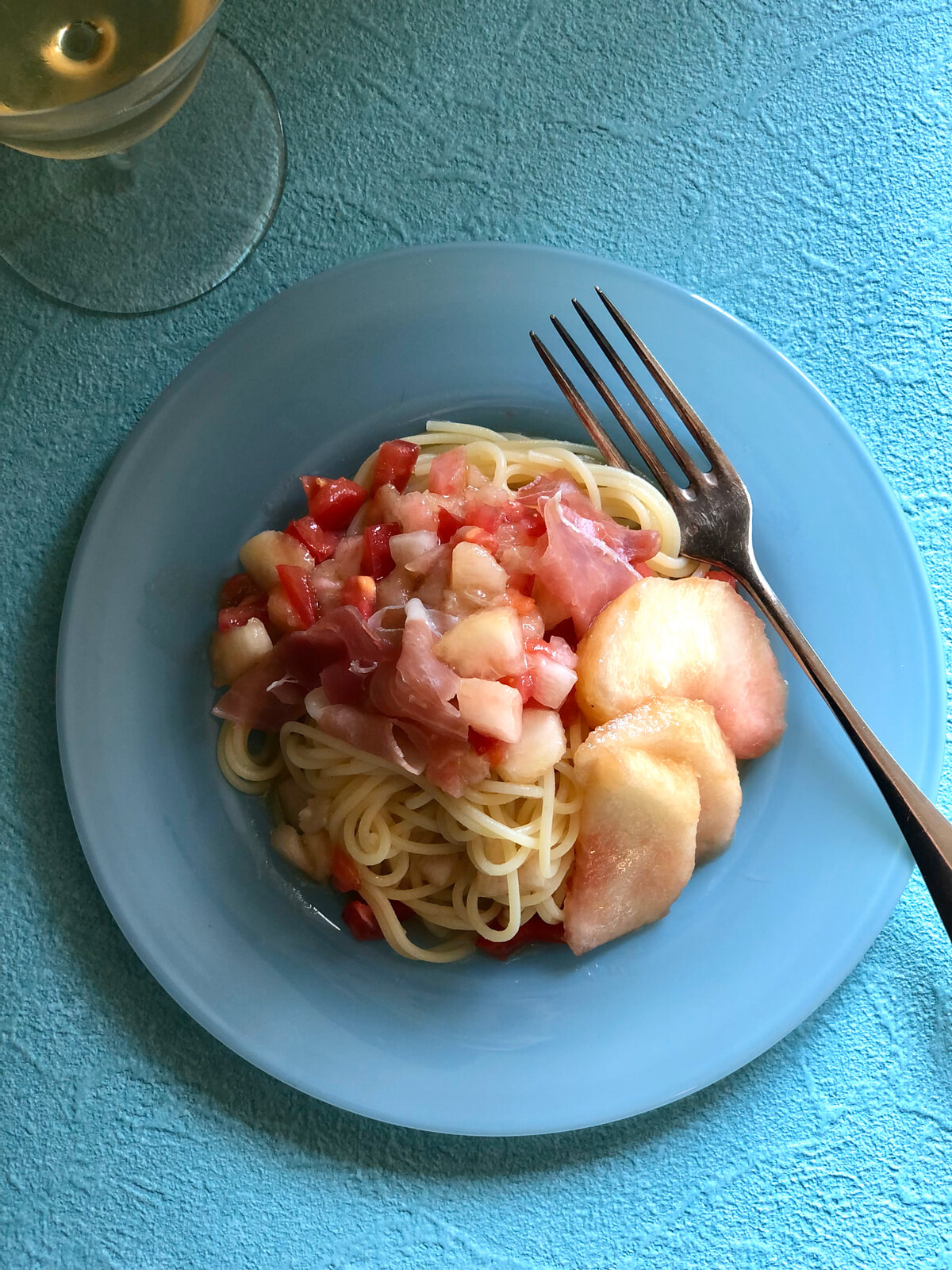 毎年、更新されていく暑さ。これから長く続くかと思うと少々げんなりしますが、こういう時には冷たいパスタでもいかがでしょう。贅沢に桃を使うと気分も上がります。こういう料理は暑い日にこそおいしいもの。