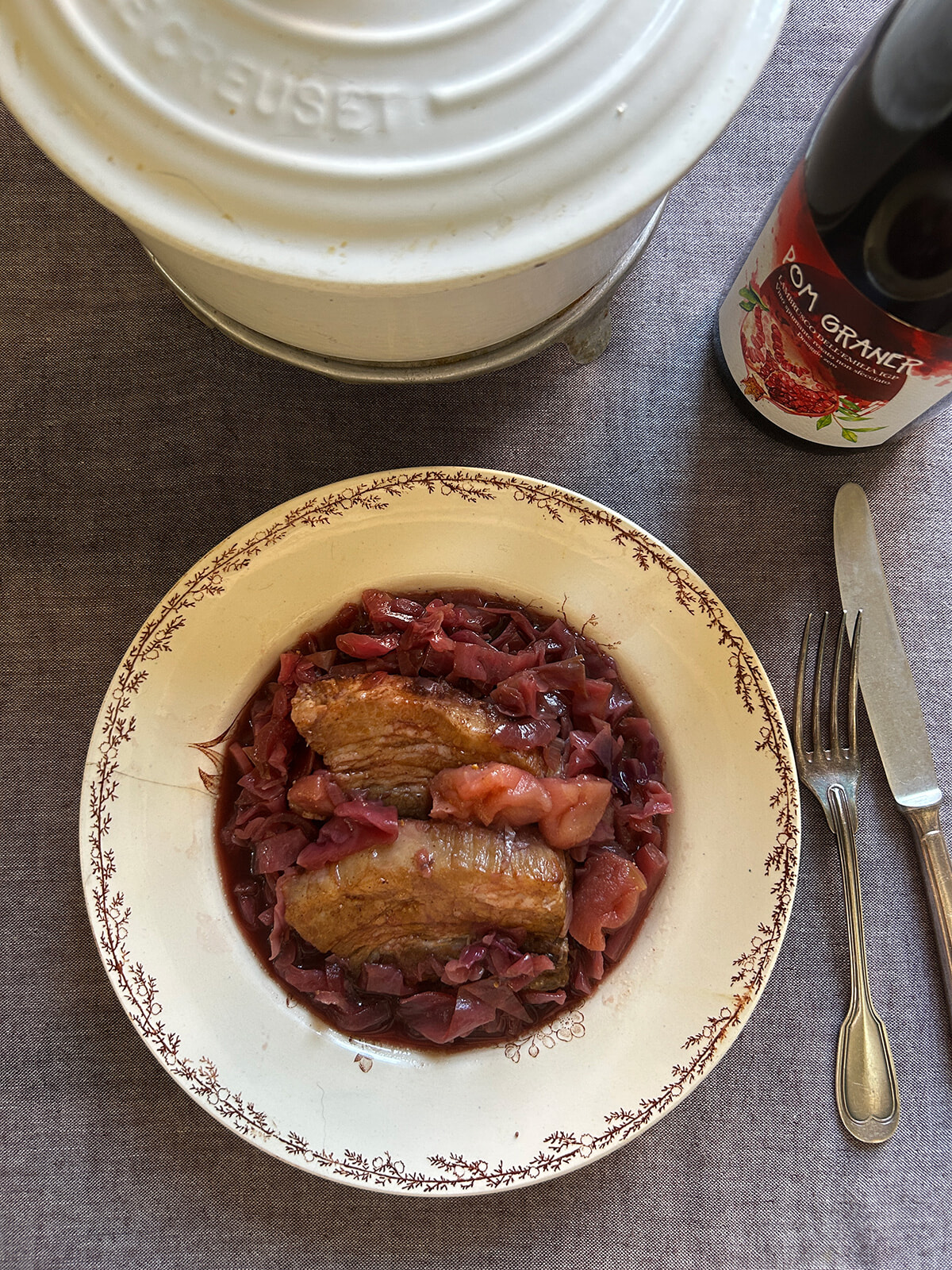 煮込みがおいしい季節がやってきました。豚肉、リンゴと一緒に紫キャベツでフランスのおばあちゃんがつくるような煮込みを。紫キャベツは普通のキャベツに比べて巻きがギュッと詰まっていて、葉が肉厚。ビネガーを加えて煮ると、鮮やかな赤い色に仕上がります。