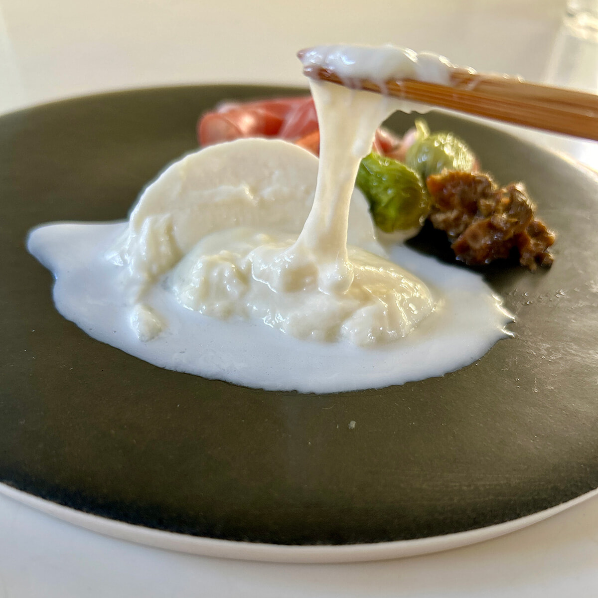 そんなふきのとうのおつまみに合わせたのは、温かいモッツァレラ。モッツァレラを袋ごと湯煎にかけると、とろりと溶けるようになり、ミルキーさはさらに際立ち、まるで作りたてのチーズのよう。お箸でつまんでみるとびよんと伸びます。