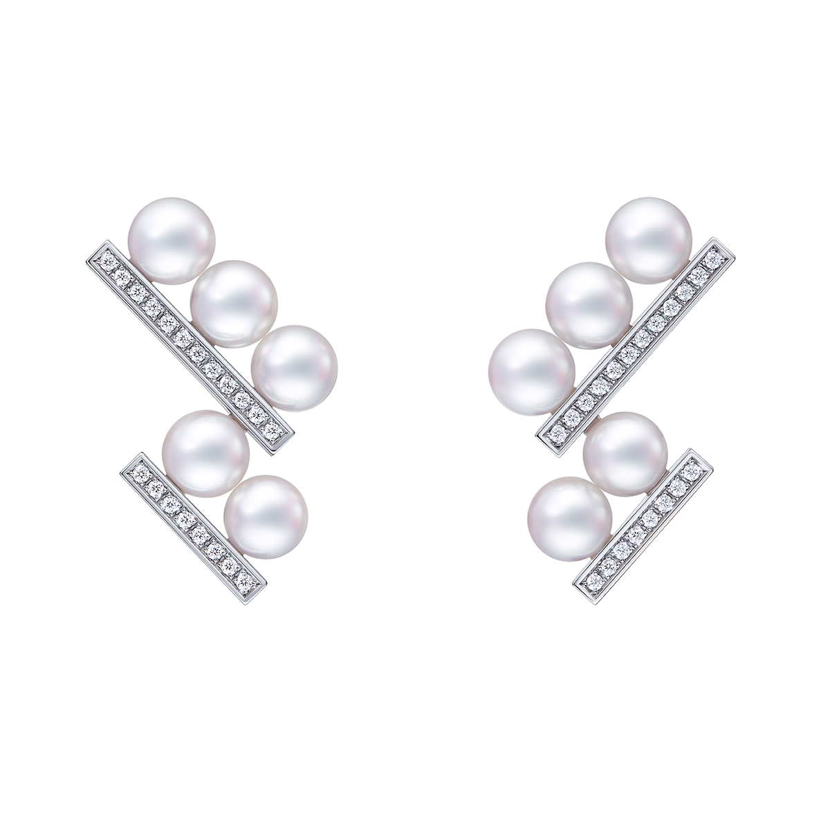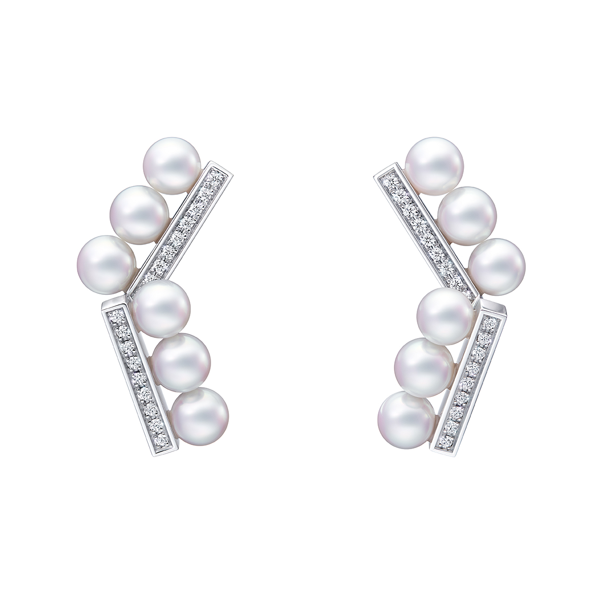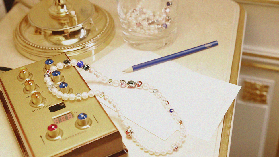 粒が揃った最高品質の真珠をアートのようにセッティング。ダイヤモンドと優美なハーモニーを奏でるバランスの新作にネックレスをノンシャランに重ね、パリジェンヌの遊び心を表現。